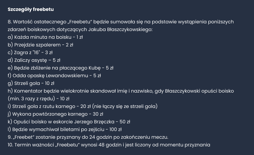 Promocja Betfan obowiązuje do dnia 16.06, godz. 20:45. Bukmacher oferuje nam różne freebety za osiągnięcia Kuby Błaszczykowskiego w meczu z Niemcami. Żeby mieć szansę na odebranie bonusów, należy postawić najpierw kupon, na którym znajdzie się zdarzenie z oferty na mecz z Niemcami. Kurs minimalny kuponu musi wynosić 2.50, a stawka dokładnie 69 zł. Po spełnieniu tych warunków, otrzymamy freebet za określone przez bukmachera zdarzenia. A jeśli nie macie jeszcze konta u tego bukmachera, koniecznie załóżcie je z naszym kodem promocyjnym Betfan.