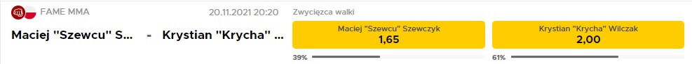 Kursy na walkę Krycha vs Szewcu, czyli... faworytem jest Szewcu, mający rekord 0-2, a nie Krycha, jeden z najbardziej doświadczonych i legitymujący się czołowym rekordem w całym FAME MMA. Dla wielu to ogromne zaskoczenie, gdyż Krycha startuje regularnie i wygrywa, a Szewcu przegrał dwa dotychczasowe pojedynki. Wygląda na to, że bukmacherzy wątpią w klasę przeciwników Krychy i choć wygrywa, uważają że cenniejsze były porażki Szewca z lepszymi zawodnikami.