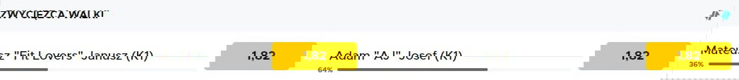 Kursy na walkę Fit Lovers vs AJ wskazują na to, że faworyta tego starcia... nie ma. Kurs na wygraną Mateusza Janusza wynosi 1.82, z kolei triumf jego rywala został oszacowany na kurs... 1.82. Jak widać, bukmacherzy nie potrafili wskazać faworyta i widzą w tym pojedynku szanse 50 vs 50.