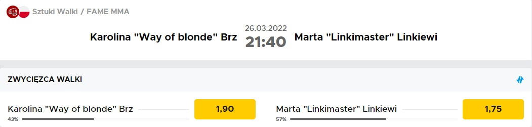 Kto jest faworytem, jeśli chodzi o kursy na walkę Linkiewicz vs Way of Blonde na FAME MMA 13. Kursy na galę FAME MMA 13 wystawił oficjalny sponsor federacji, czyli zakłady bukmacherskie Betclic (zobacz kod promocyjny Betclic). Trzeba przyznać, że kursy są niezwykle wyrównane. Nieznaczną faworytką, co dla wielu może być zaskakujące, jest Marta Linkiewicz - kurs 1.75. Z kolei wygrana Way of Blonde została oszacowana na kurs 1.90.
