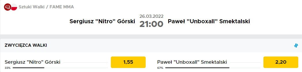 Kursy na walkę Nitro vs Unboxall na FAME MMA 13 znajdziemy w zakładce Sztuki Walki na stronie lub w aplikacji mobilnej Betlic. Bukmacherzy uważają, że faworytem tego starcia jest Sergiusz Górski, czyli popularny Nitro. Kurs na jego wygraną wynosi 1.55, podczas gdy triumf Unboxalla oszacowano na 2.20. Skąd takie kursy? Jeśli wierzyć obu zawodnikom, wychodzi na to, że Nitro trenuje... miesiąc dłużej od swojego przeciwnika. Dla obu zawodników będzie to jednak debiut, o umiejętnościach obu wiadomo tyle, co nic, więc tak naprawdę trudno przewidzieć, kto jest faworytem walki wieczoru gali FAME MMA 13.