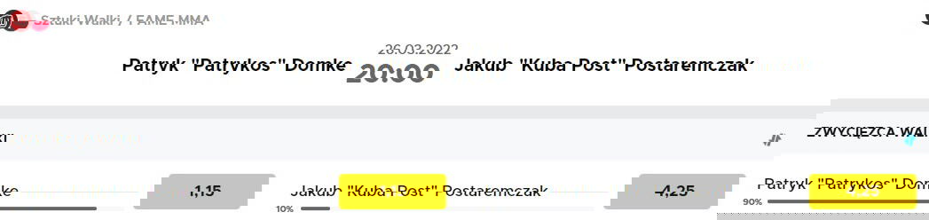 Kto jest faworytem, jeśli chodzi o kursy na walkę Patrykos vs Kuba Post na FAME MMA 13. Kursy na galę FAME MMA 13 wystawił oficjalny sponsor federacji, czyli zakłady bukmacherskie Betclic (odbierz kod promocyjny Betclic). Patrykos, czyli Patryk Domke jest największym faworytem na całej gali z numerem 13. Kurs na jego wygraną wynosi 1.15, podczas gdy jego przeciwnik - co oczywiste - jest największym underdogiem na FAME MMA 13.